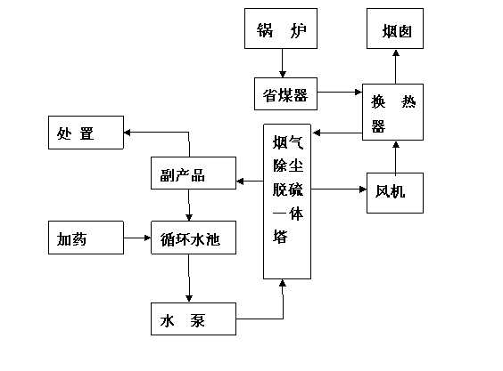 本方案設計流程:煙氣→余熱回收裝置(省煤器)→換熱器→脫硫除塵一體塔→換熱器→排放。