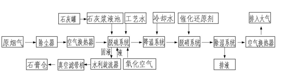 石膏法脫硫+濕法催化脫硝工藝,整套系統(tǒng)由以下子系統(tǒng)組成:
